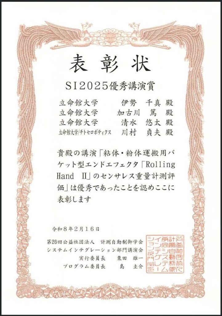 加古川研究室M1の伊勢千真君が第26回計測自動制御学会 システムインテグレーション部門講演会(SI 2025)で優秀講演賞を受賞しました!